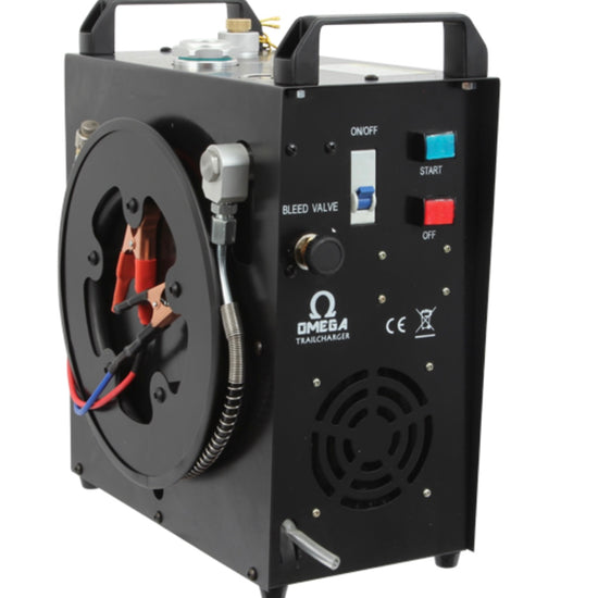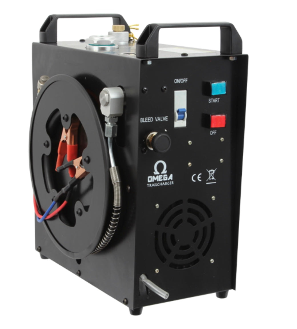 The Omega compressors have a reputation for high performance at competitive prices. The new Omega Trail Charger has many features in common with its bigger brothers. The Omega Trail Charger is designed as a portable machine that can run off of a 110V wall outlet with included inverter or a 12V car battery. The Trail Charger is water cooled this is a vital feature for long service life. The filling of a small bottle or air tube is hassle free with an auto shut off that the user sets at the desired pressure. This eliminates the user from having to watch the fill pressure gauge as the compressor does its job. The Omega Trail Charger is capable of filling directly to your onboard bottle. The run time to fill a 190cc cylinder from 1800psi to 3300psi is a swift 2:30 minutes. The Trail Charger filled a 480cc carbon bottle from 1800psi to 3500psi in a mere 8:30 minutes. The duty cycle of the machine is 30 minutes run / 20 minutes cool. This allows for filling of smaller portable tanks as long as the unit is allowed to cool. We tested the Trail Charger on a empty 18cf tank and it filled from 0 to 4500 in only 90 minutes of run time. Larger tanks can be filled as well, although this is not the primary function of this small portable compressor. Included features are a water site-glass, a grease pot for internal lubrication, burst disc, bleed valve to remove moisture, breaker switch, cables for car battery use, inverter for home or office, carry handles and rubber feet. The Omega Trail Charger is the gold standard in portable filling systems.