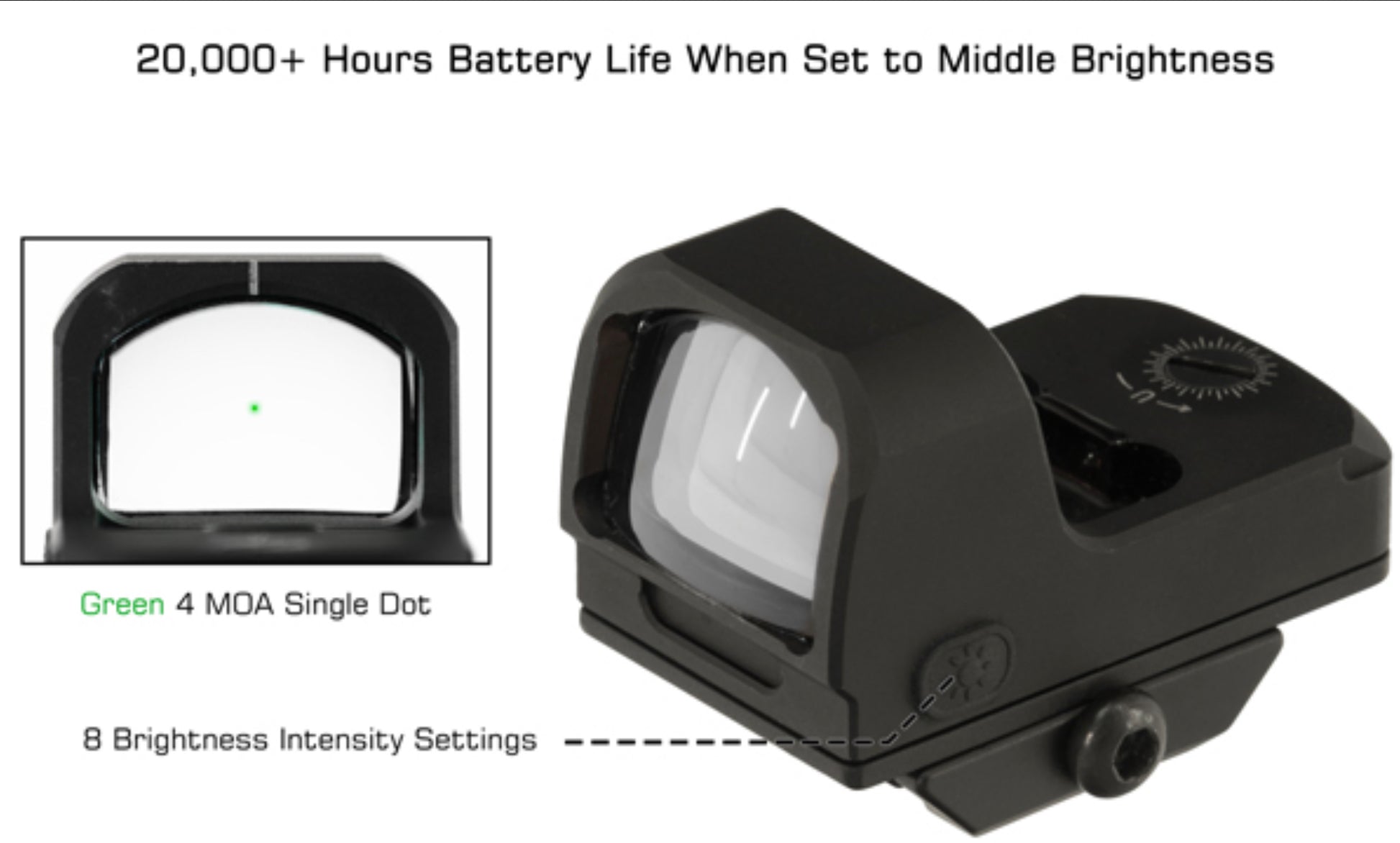 - Green 4.0 MOA Single Dot with 8 Brightness Intensity Settings