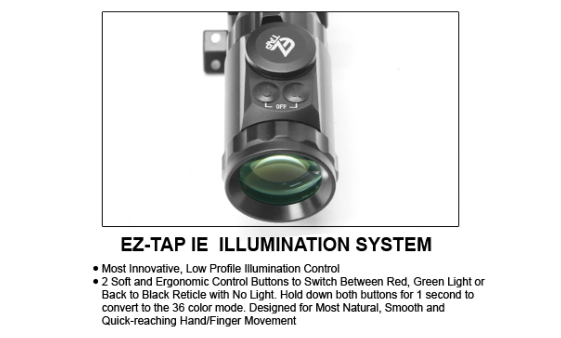 - Innovative EZ-TAP® Illumination Enhancing (IE®) System with Red/Green Dual-Color Mode and 36 Color Multi-Color Mode to Accommodate All Weather/Light Conditions (US PAT. 8437079; EU PAT. EP2520894)